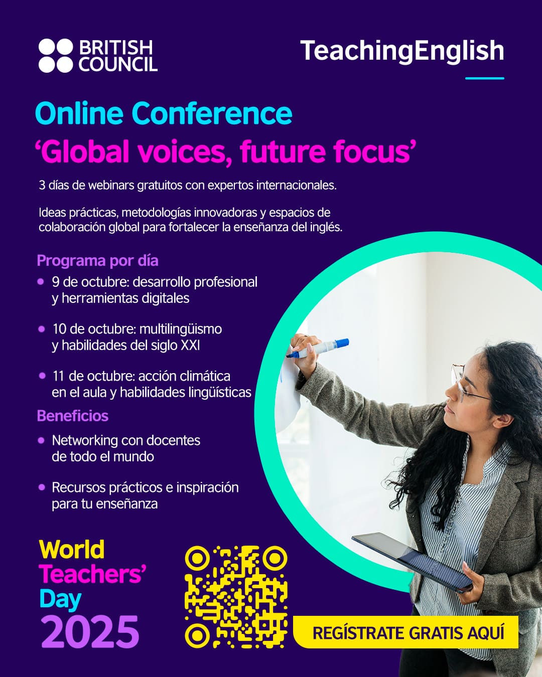 La agenda completa, la lista de ponentes y el registro gratuito están disponibles en: www.teachingenglish.org.uk/world-teachers-day-2025