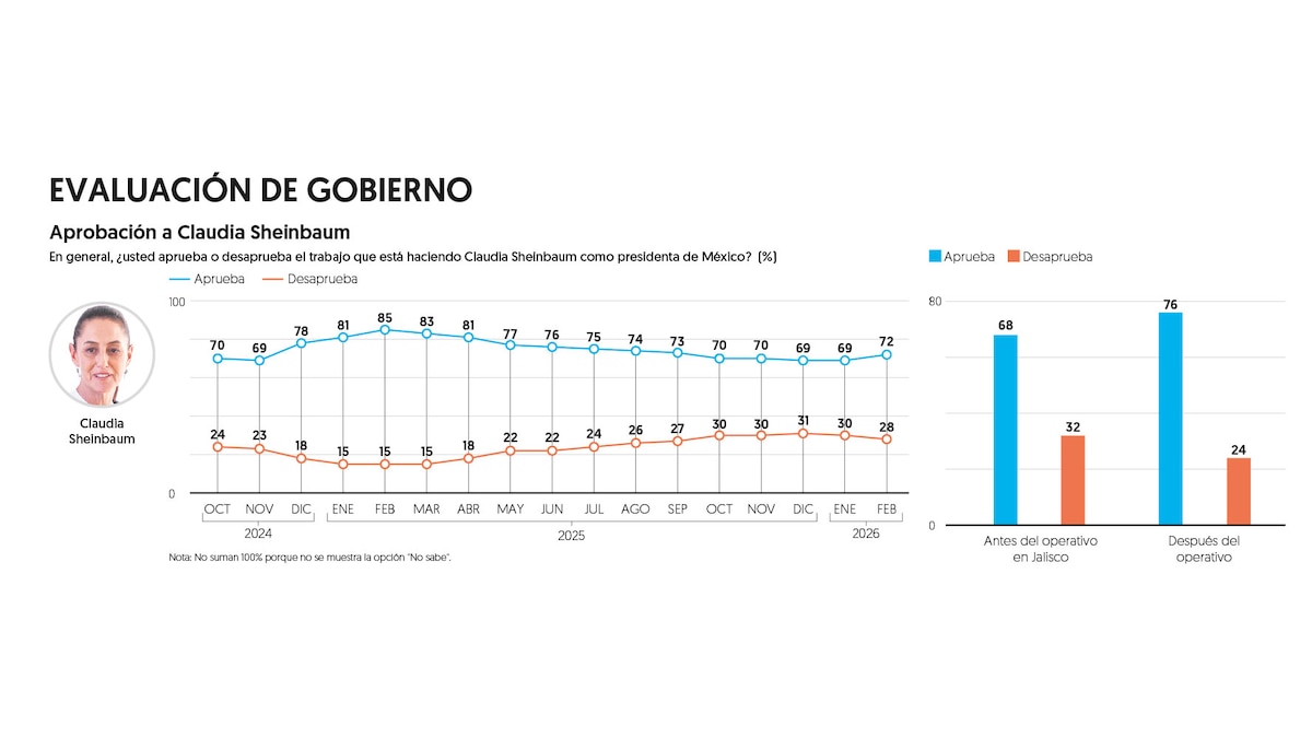 La presidenta registró 72 por ciento de respaldo popular en febrero; 76 por ciento después del abatimiento de ‘El Mencho’ Oseguera
