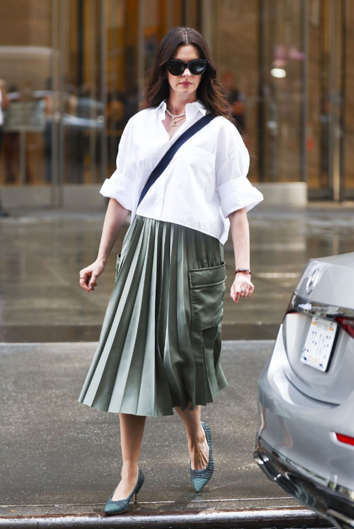 Uno de los más comentados: total look blanco con líneas arquitectónicas, pantalones de estructura fluida, blusa de manga amplia, kitten heels y un collar chunky que marca el paso (literalmente) en las calles de Nueva York. El mejor ejemplo de cómo una sola pieza de joyería puede convertir una base neutra en un look editorial.