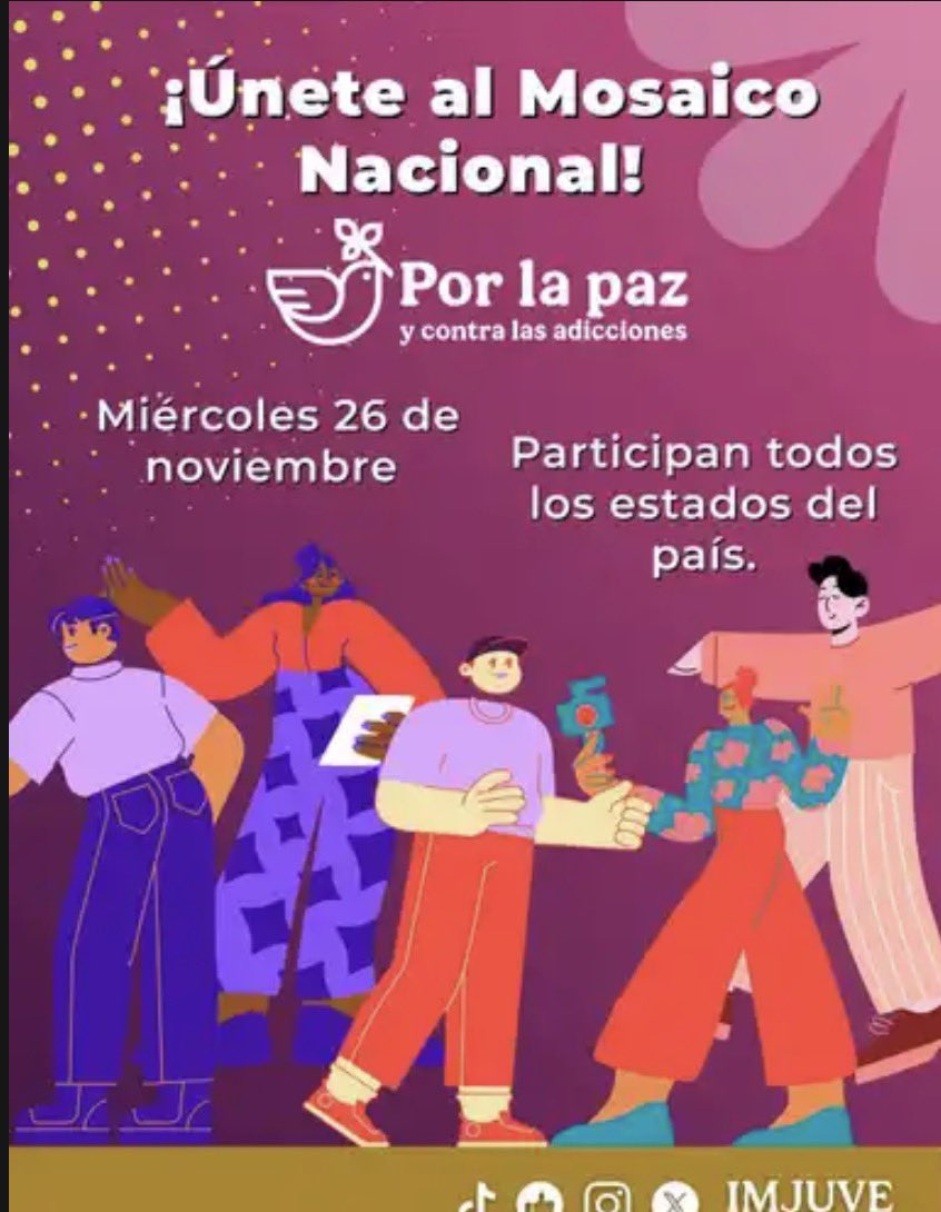 Ciudad de México, a 24 de noviembre de 2025.- Como parte de la Estrategia por la Paz y contra las Adicciones que impulsa la Presidenta Claudia Sheinbaum Pardo, el Instituto Mexicano de la Juventud (IMJUVE) anunció el “Mosaico Nacional por la Paz y contra las Adicciones”, una actividad que tiene el objetivo de reunir a miles de jóvenes de escuelas y comunidades de los 32 estados del país de manera virtual para enviar un mensaje de paz.