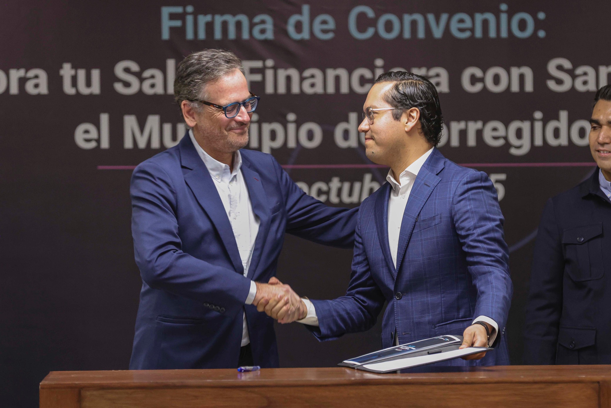 El Presidente Municipal de Corregidora, Chepe Guerrero y el Director Ejecutivo de Distribución y Regionalización de Banco Santander México, Antonio Basagoiti, firmaron un convenio para la entrega de mil becas “Salud Financiera Santander” para universitarios, iniciativa que promueve una mejor administración del dinero, el ahorro y el uso responsable del crédito
