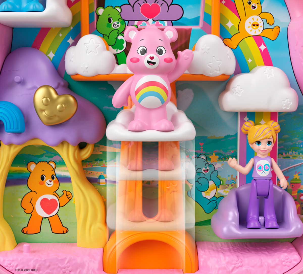 El mini set encapsula todo lo que hacía (y sigue haciendo) especial a Polly Pocket: un estuche en forma de cabeza de osito rosa —inspirado en Cheer Bear— que se abre para revelar un universo de arcoíris, nubes esponjosas, árboles morados, y escenarios en niveles. Dentro, encontrarás una figura articulada estilo Polly, dos figuras miniatura de Care Bears, y más de una docena de pequeños accesorios temáticos: pastelitos, arcoíris, hongos mágicos, objetos dorados y hasta una regadera celeste. Cada pieza añade un detalle encantador a este mundo diminuto donde todo es posible.