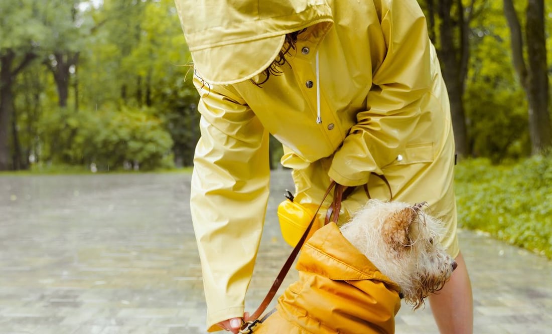 4. Que el estilo no se moje: Pasear bajo la lluvia puede ser seguro si se toman precauciones. Un impermeable ligero, una pechera ajustada y botitas antideslizantes protegen a tu mascota del contacto con superficies contaminadas. Al regresar, seca bien su cuerpo, especialmente orejas, abdomen y entre los dedos para evitar la acumulación de humedad y la aparición de hongos.