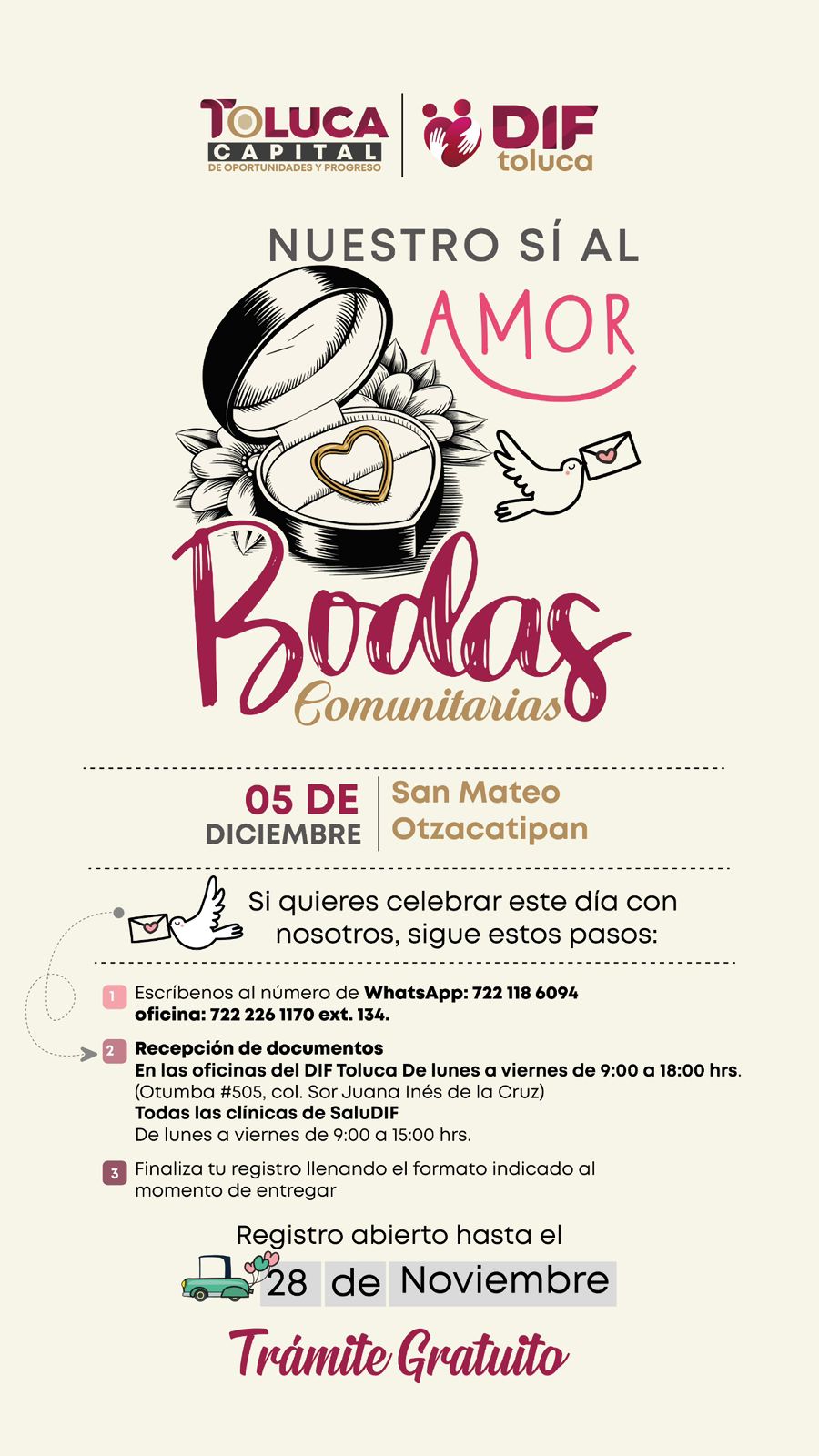 Para más información deberán comunicarse al 722 226 1170 extensión 134, o bien al 722 603 2622, donde personal especializado responderán cualquier duda que las parejas puedan tener sobre el proceso, pues entre la ciudadanía y el gobierno se construye un municipio donde todas las historias de amor pueden florecer con seguridad y dignidad.