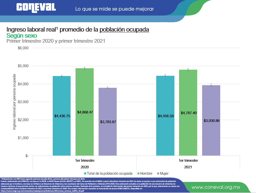 En el primer trimestre 2021, el ingreso laboral real promedio de la población ocupada a nivel nacional fue de $4,456.58 al mes. Los hombres ocupados reportaron un ingreso laboral mensual de $4,787.40 y las mujeres, $3,930.86; la brecha de los ingresos laborales entre hombres y mujeres es de $856.54 en este trimestre, la cual es $228.05 menor que la del primer trimestre 2020 ($1,084.59). En términos relativos para este trimestre el ingreso de los hombres ocupados es aproximadamente 1.2 veces el de las mujeres, lo que indica una proporción similar al mismo periodo del año anterior (1.3 veces más).