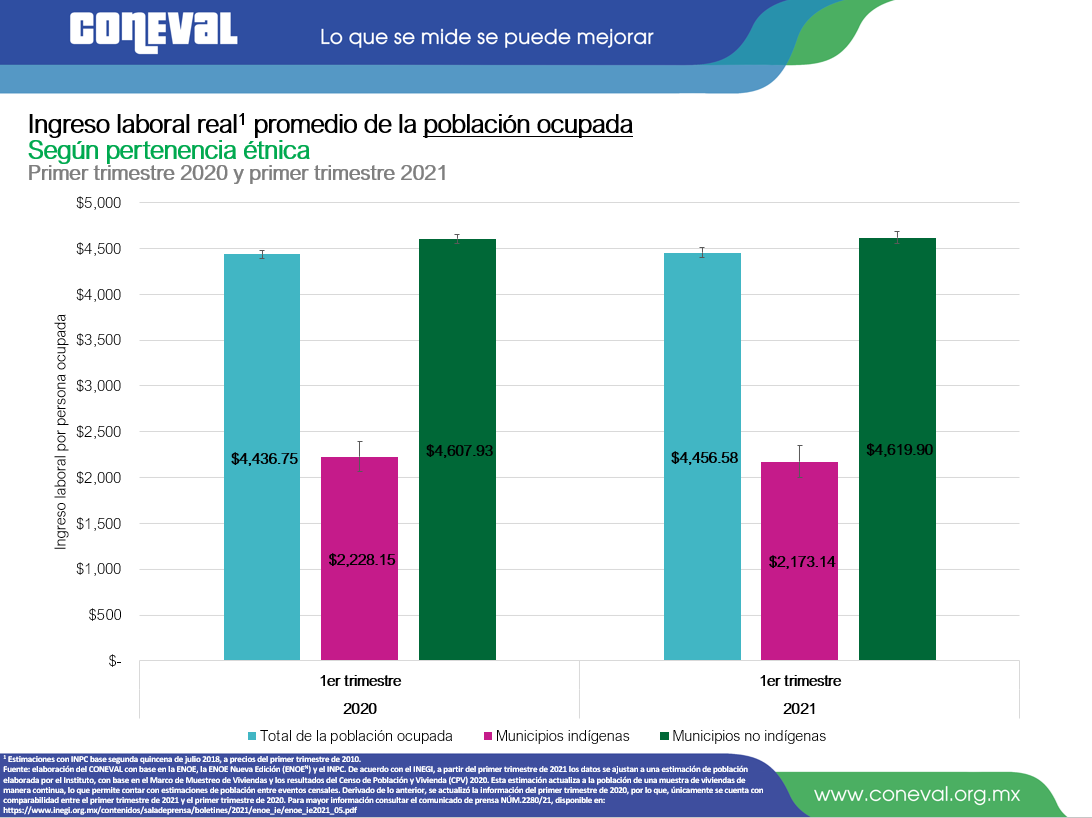 En el primer trimestre 2021, el ingreso laboral real promedio del total de la población ocupada que reside en municipios no indígenas fue de $4,619.90 al mes, mayor respecto al de los ocupados residentes en municipios indígenas, cuyo ingreso promedio fue de $2,173.14. Es decir, el ingreso laboral real promedio de los ocupados en el primer trimestre 2021, en municipios indígenas es aproximadamente la mitad que el de aquellos que residen en municipios no indígenas.
