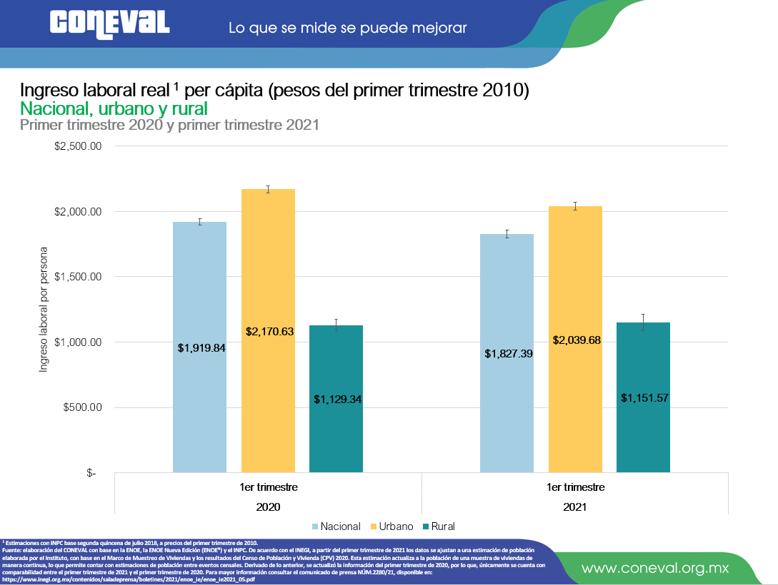 El poder adquisitivo del ingreso laboral real per cápita tuvo una disminución de 4.8% entre el primer trimestre 2020 y el primer trimestre 2021, al pasar de $1,919.84 a $1,827.39. Esta variación anual del ingreso laboral representa una pérdida de $92.46 pesos respecto al primer trimestre de 2020, antes del inicio de la pandemia por COVID-19.