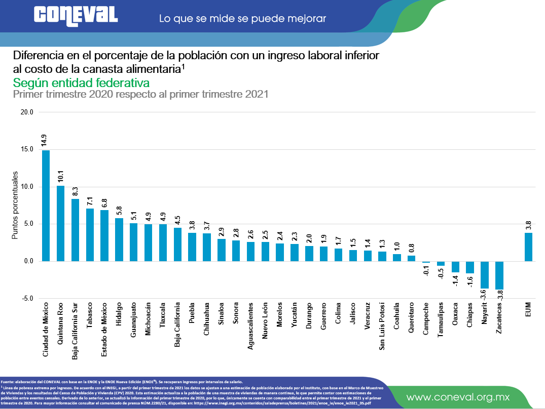El porcentaje de población que no puede adquirir la canasta alimentaria con su ingreso laboral entre el primer trimestre 2020 y el primer trimestre 2021 aumentó a nivel nacional 3.8 puntos porcentuales, lo cual se vio reflejado en un incremento de la pobreza laboral en 26 de las 32 entidades federativas. Destacan Ciudad de México con un incremento de 14.9; Quintana Roo con 10.1 y Baja California Sur con 8.3 puntos.