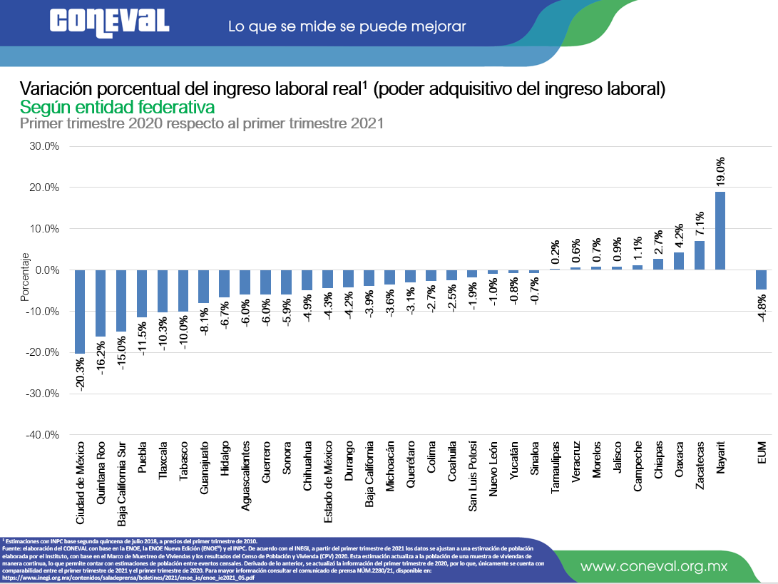 Un total de 9 entidades presentaron un aumento del ingreso laboral real por persona en comparación al año anterior, las tres entidades con mayor crecimiento fueron: Nayarit (19.0%), Zacatecas (7.1%) y Oaxaca (4.2%) y aquellas que presentaron las mayores disminuciones en el ingreso fueron: Ciudad de México (20.3%), Quintana Roo (16.2%) y Baja California Sur (15.0%).