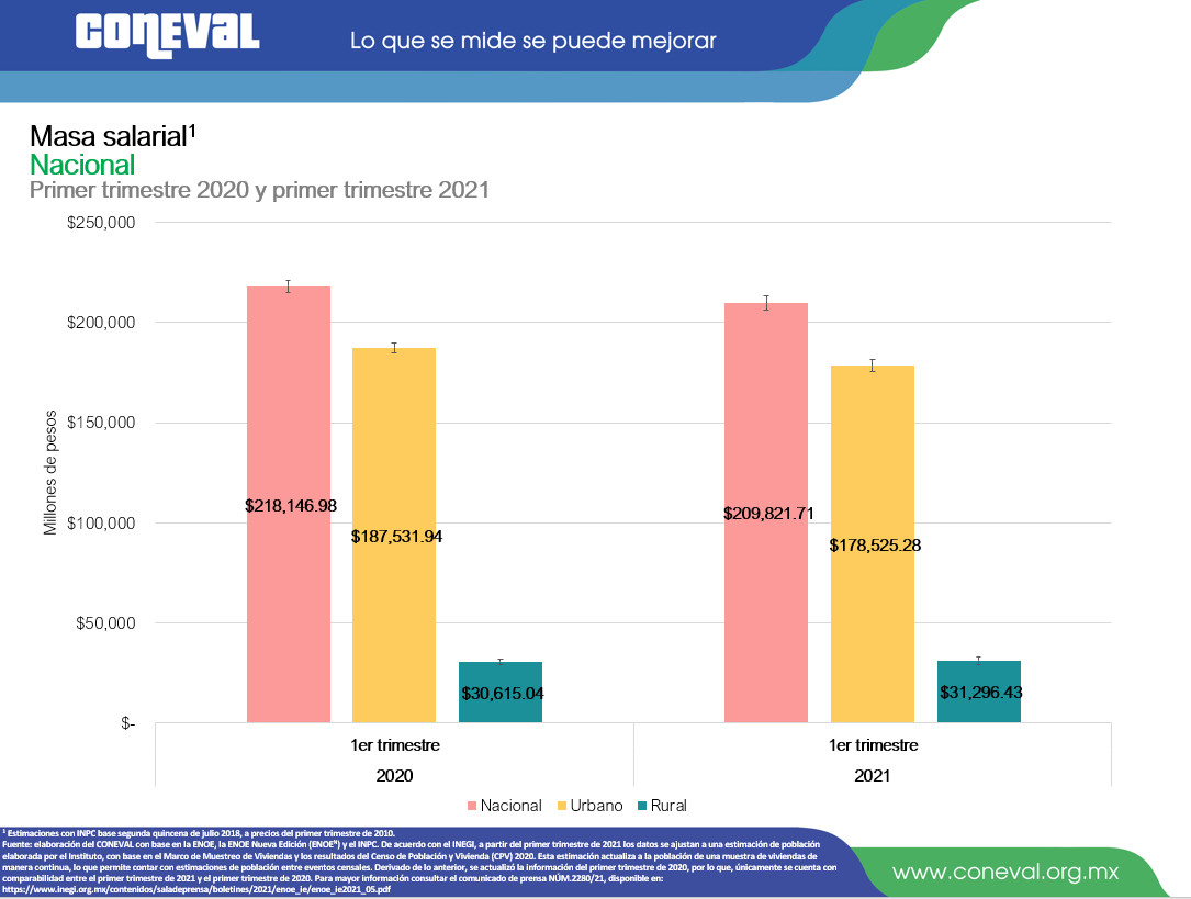 La masa salarial (monto de las remuneraciones totales de los ocupados) disminuyó 3.8% entre el primer trimestre 2020 y el mismo periodo del 2021, al pasar de $218,146.98 a $209,821.71 millones de pesos. Lo anterior representa una disminución de $8,325.27 millones de pesos entre estos periodos. La disminución anual de la masa salarial se da ante una disminución en el ingreso laboral real y del número de ocupados durante este periodo.
