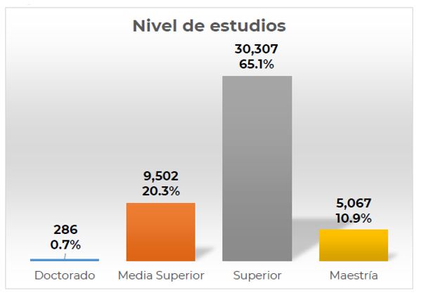 Resaltan las personas con un nivel de estudios superior con el 65.1% de participación, media superior con el 20.3%, maestría con 10.9% y con doctorado el 0.7%.