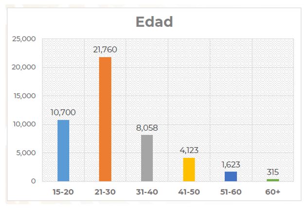Asimismo, por edad, sobresale el sector de 21 a 30 años con 21,760 personas inscritas, el de 15 a 20 años: 10,700, de 31 a 40 años: 8,058, 41 a 50 años: 4,123, 51 a 60 años: 1,623 y de 60 años o más: 315.