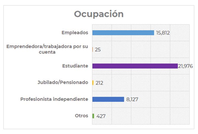 Por ocupación se inscribieron 21,976 estudiantes, 15,812 empleados, 8,127 profesionistas independientes, 212 jubilados o pensionados y 25 personas emprendedoras o que trabajan por su cuenta.