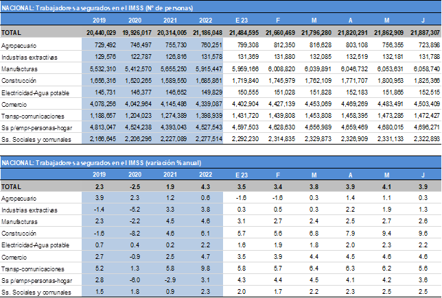 A nivel nacional, sumando todos los sectores, los trabajadores asegurados en el IMSS se ubicaron en 21.89 millones de personas al mes de junio. Es un nuevo máximo histórico en este segmento del empleo nacional; al igual que en las manufacturas, donde están registrados 6.06 millones de trabajadores. También, se registran máximos históricos en la construcción y el comercio, no en los demás sectores.