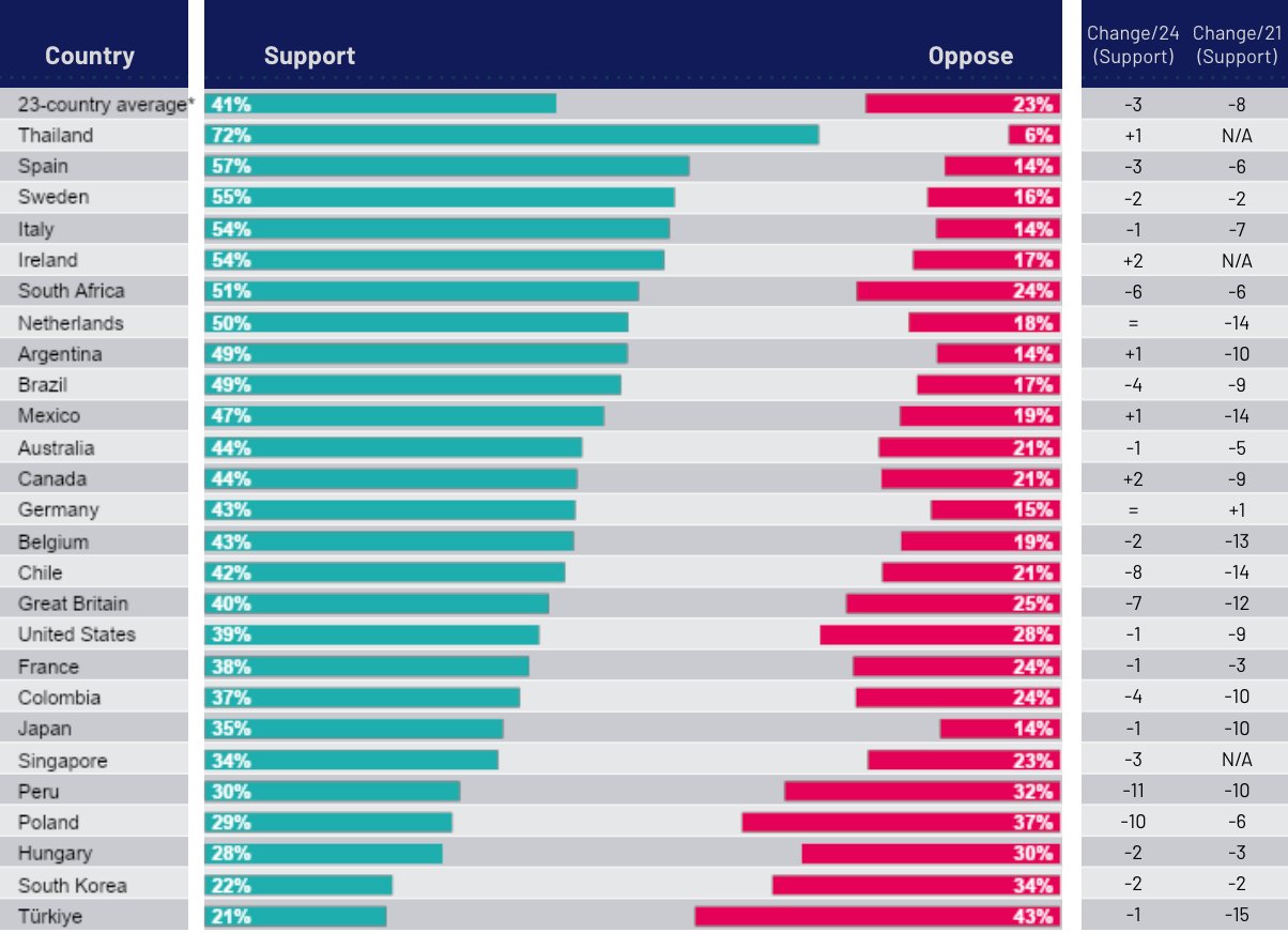 Solo el 22 % (promedio en 23 países) está a favor de que los atletas trans compitan según el género con el que se identifican en lugar del sexo que les asignaron al nacer en 2025, frente al 27 % en 2024 y al 32 % en 2021. El apoyo es ahora más alto en Tailandia (50 %) y más bajo en Hungría (11 %).