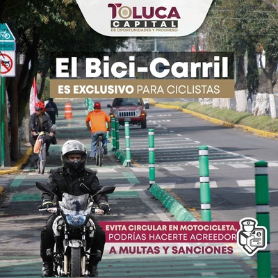 Asimismo, los motociclistas no deben circular en las áreas exclusivas para peatones y ciclistas, pues de acuerdo al artículo 129, fracción XXV, del Bando Municipal, quien no respete esta medida e invada ciclovías, bicicarriles o cajas bicimoto en intersecciones semaforizadas, será acreedor a una infracción conforme lo determine el Reglamento de Tránsito del Estado de México.