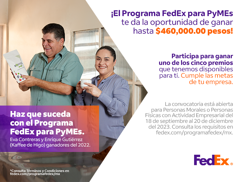Para revisar todos los términos y condiciones, incluyendo los criterios de participación y evaluación, los interesados deben visitar www.fedex.com/programafedex/mx. Para participar no se requiere que los participantes realicen alguna compra ni necesitan ser clientes de FedEx.