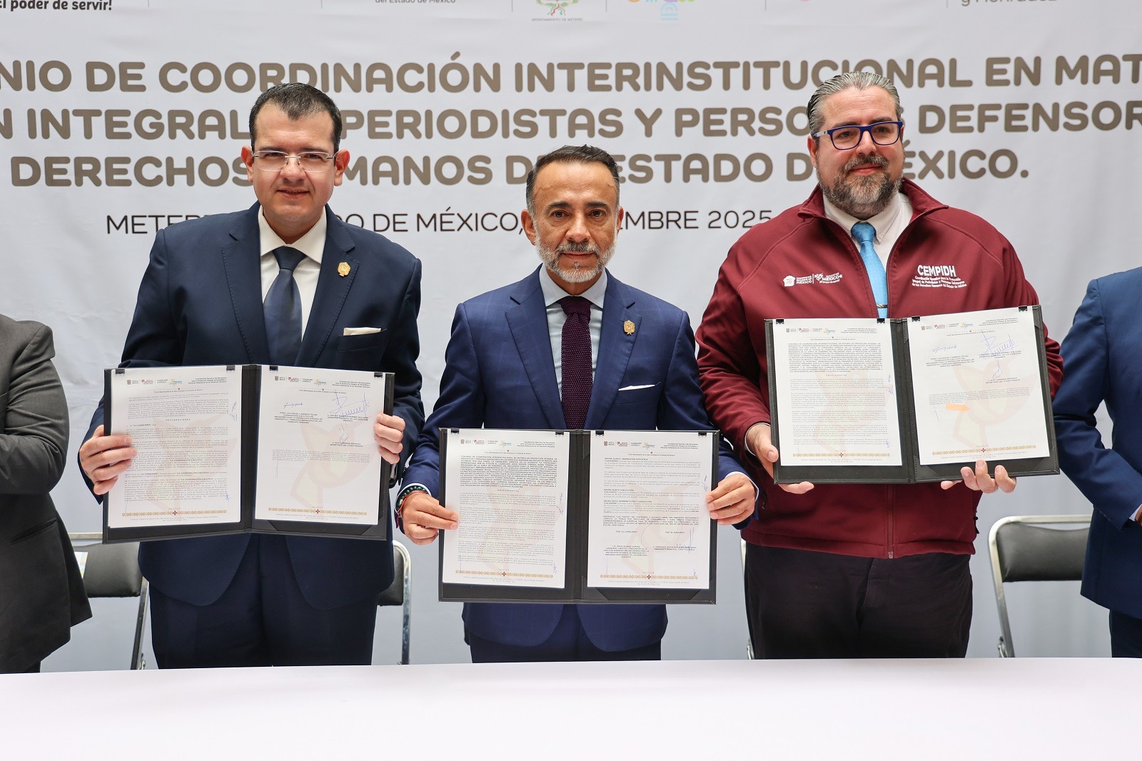 METEPEC, Estado de México.- El Gobierno del Estado de México y el Ayuntamiento de Metepec firmaron un convenio de coordinación interinstitucional en materia de protección integral para periodistas y personas defensoras de los derechos humanos, para fortalecer la defensa y seguridad de ambos grupos, en caso de presentarse alguna situación de riesgo al desempeñar su labor.