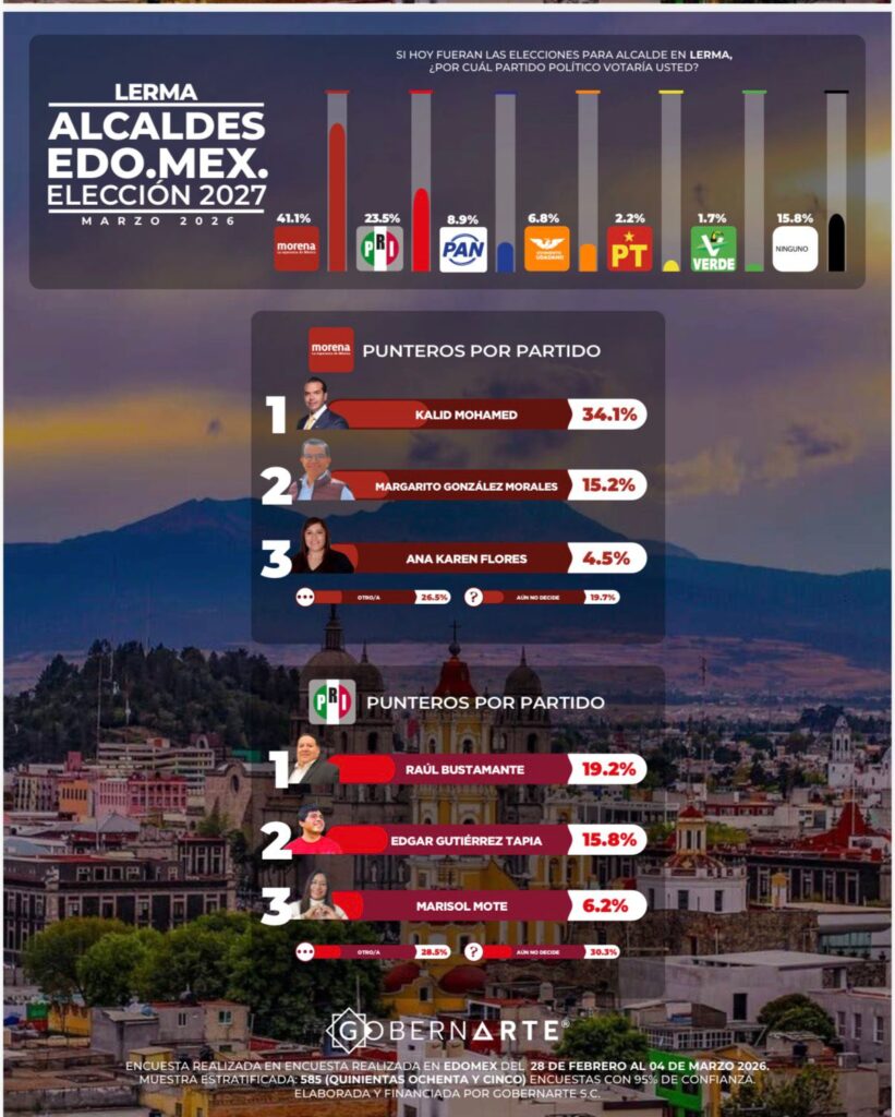 Dentro de ese contexto, Kalid Mohamed se posiciona como el aspirante mejor evaluado, registrando 34.1% de preferencia, lo que lo coloca como el perfil más competitivo rumbo a la contienda por la presidencia municipal de Lerma.
