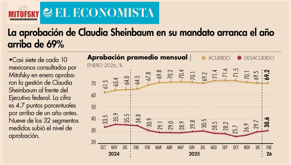 El Economista. En el arranque del año, 69.2% de los mexicanos aprobó en promedio a nivel nacional el desempeño gubernamental de la presidenta Claudia Sheinbaum Pardo; la cifra es 4.7 puntos superior que la registrada en enero de 2025, pero 0.3% inferior que la de diciembre pasado.