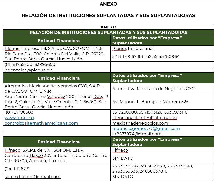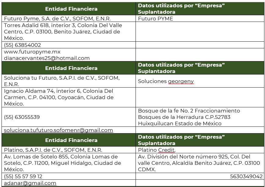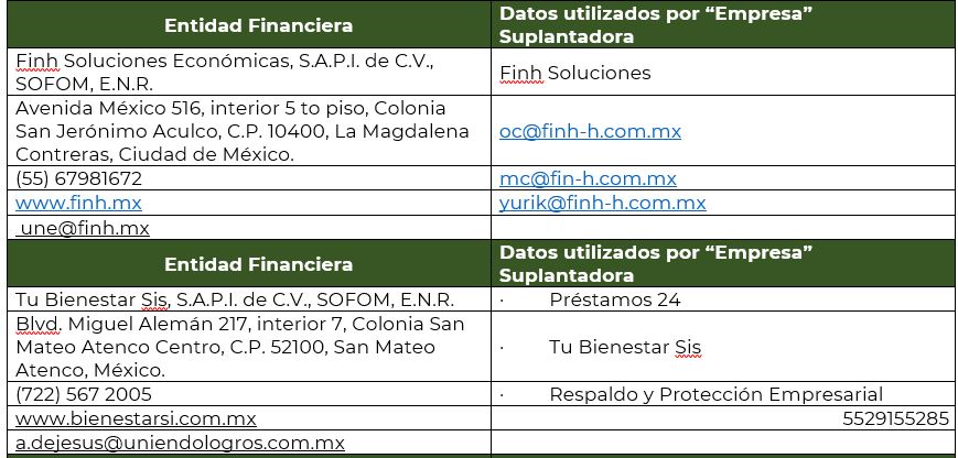 ·Las 12 instituciones financieras han informado a esta autoridad, la suplantación de su razón social por personas físicas o empresas, que buscan afectar económicamente a quienes requieren de un crédito o un seguro.