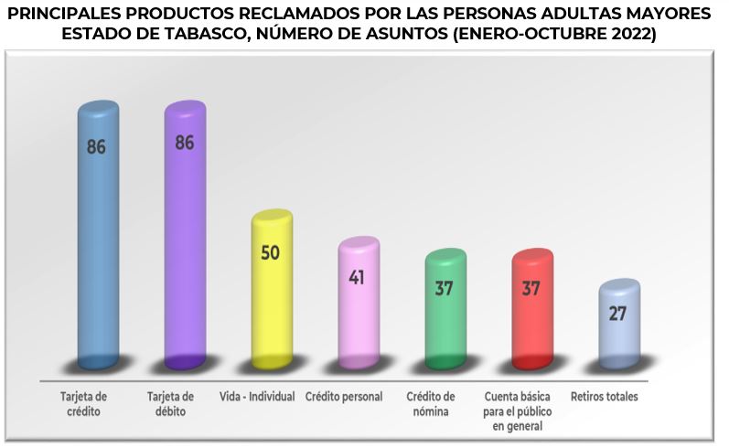 Por su parte, el segmento de personas adultas mayores representó el 27.2% de las reclamaciones totales en el periodo enero – octubre de 2022 y los productos que más reclamó este grupo de la población fueron la tarjeta de crédito, la tarjeta de débito y el seguro de vida – individual.