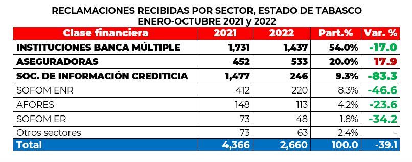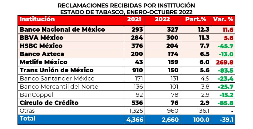 Por su parte, las instituciones que registraron el mayor número de reclamaciones en el estado de Tabasco fueron Banco Nacional de México, BBVA México, HSBC México y Banco Azteca, que en conjunto estas 4 concentraron el 38% del total.