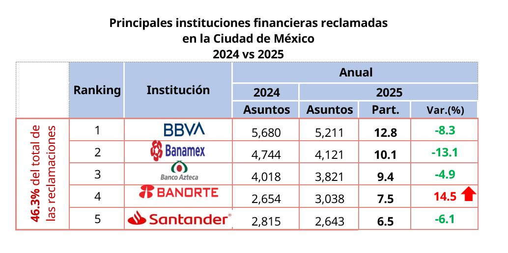 Por sector, la Banca Múltiple acumuló el 64.1% de las reclamaciones, seguida de las Aseguradoras con 14.3% y las Sofom ENR con el 6.7%.