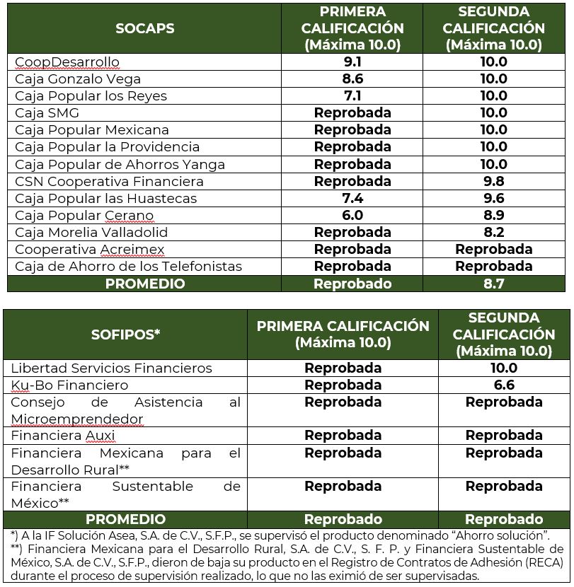 Dentro de este proceso participaron 13 Sociedades Cooperativas de Ahorro y Préstamo (SOCAPS) y 6 Sociedades Financieras Populares (SOFIPOS), que ofrecen este producto a sus socios o clientes, con resultados muy deficientes, a pesar de que la normatividad no es nueva o se ha modificado, lo que resulta en perjuicio del usuario de servicios financieros.