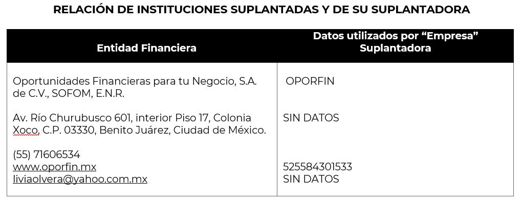 • 9 instituciones financieras debidamente constituidas e inscritas en el SIPRES, han informado a esta autoridad la suplantación de su razón social por personas físicas o “empresas”, que buscan afectar económicamente a quienes requieren de un crédito.