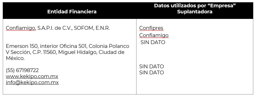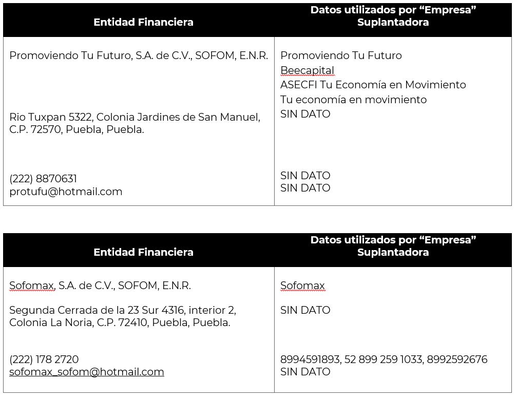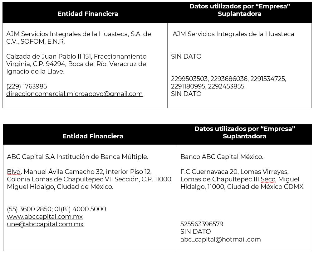 2. Utilizan información como razón social, direcciones, teléfonos e imagen corporativa (logotipos) de las entidades financieras debidamente autorizadas y registradas, para hacerse pasar por ellas.