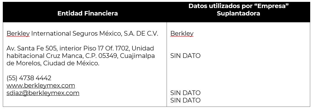 Cabe hacer la aclaración que en el caso particular de Berkley International Seguros México, S.A. DE C.V., los suplantadores se ostentan como Berkley, usurpando el uso de la palabra “Berkley” de la razón social verdadera o registrada en el Sistema de Registro de Prestadores de Servicios Financieros. El modus operandi utilizado es, ofrecer supuestos “créditos personales” y un “Seguro Colectivo de Deudores”, lo cual, por el sector al que pertenece esta aseguradora no puede ofrecer “Crédito Personales” y, en cuanto al Seguro Colectivo de Deudores, la propia aseguradora ha manifestado que no tiene autorizado por parte de la Comisión Nacional de Seguros y Fianzas operar este tipo de producto.