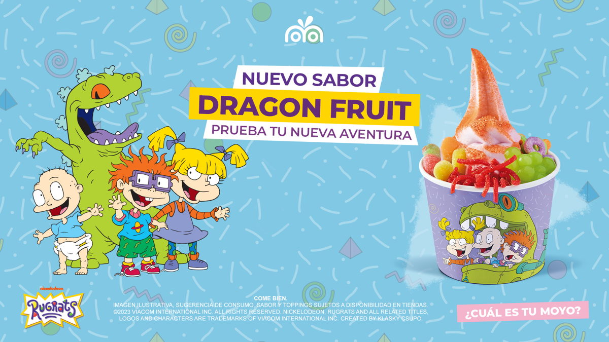 Como parte de la alianza con Nickelodeon, Moyo lanzó un nuevo sabor inspirado en el particular mundo de Rugrats: “Dragon Fruit”. El divertido estilo de Reptar se puede saborear en el helado base, mientras que cada uno de los toppings rinde homenaje a los personajes que a más de una generación han enseñado sobre la vida con sus aventuras: la irreverencia de Carlitos se convierte en Skwinkles, los juegos serpenteantes de Fili y Lili en las viboritas para añadir al gusto, la inseparable muñeca Cynthia de Angélica Pickles y su toque picosito en polvo Miguelito, más unas perlitas de manzana verde simulando las escamas de Reptar.