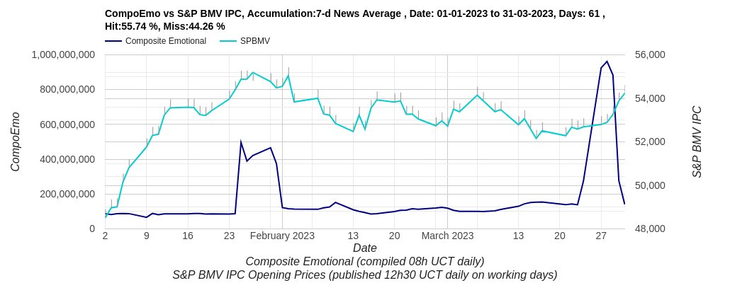 “Al analizar literalmente miles de millones de puntos de datos y usar un agregado de emociones ‘representativas’ que rastreamos, constituimos un índice: el Índice de emociones compuestas (CompoEmo), que constantemente nos brinda una correlación superior al 50% y, a menudo, superior al 60% entre los movimientos de nuestro índice, y el precio de apertura de S&P BMV IPC en el mismo día”, comentó.