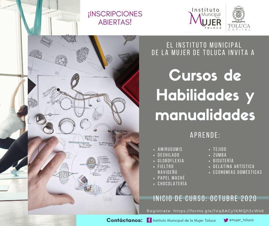 Toluca, Estado de México, domingo 20 de septiembre de 2020.- El Instituto Municipal de la Mujer invita a inscribirse en los Cursos de Habilidades y Manualidades, en los que de forma gratuita podrán aprender amigurumis, deshilado, globoflexia, fieltro navideño, papel maché, chocolatería, tejido, zumba, bisutería, gelatina artística y economía doméstica.