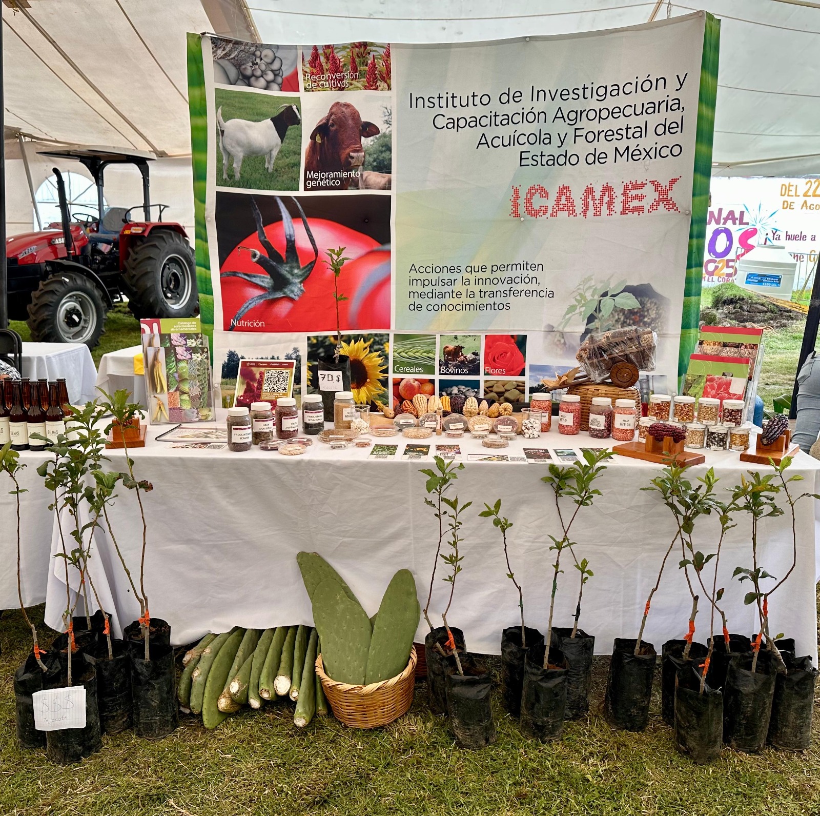 La Secretaría del Campo, a través del Instituto de Investigación y Capacitación Agropecuaria, Acuícola y Forestal del Estado de México (Icamex), instaló un módulo para exhibir maíces en resguardo del Banco de Germoplasma y semillas disponibles para productores; además de árboles frutales como el de tejocote Calpan Gold y pencas de nopal Copena. También se impartió información de los servicios de investigación y capacitación que ofrece el Instituto.