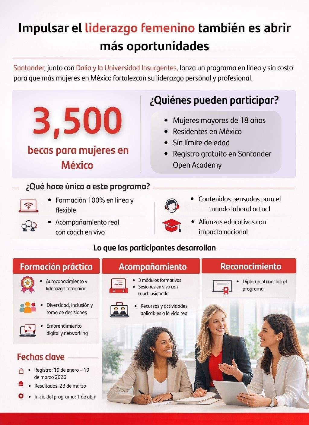Banco Santander México, en colaboración con Dalia y la Universidad Insurgentes (UIN), lanza la edición 2026 del Curso Santander Mujeres Líderes 2026un programa de formación en línea que otorgará 3,500 becas a mujeres mayores de 18 años residentes en México, con el objetivo de fortalecer su desarrollo personal y profesional.