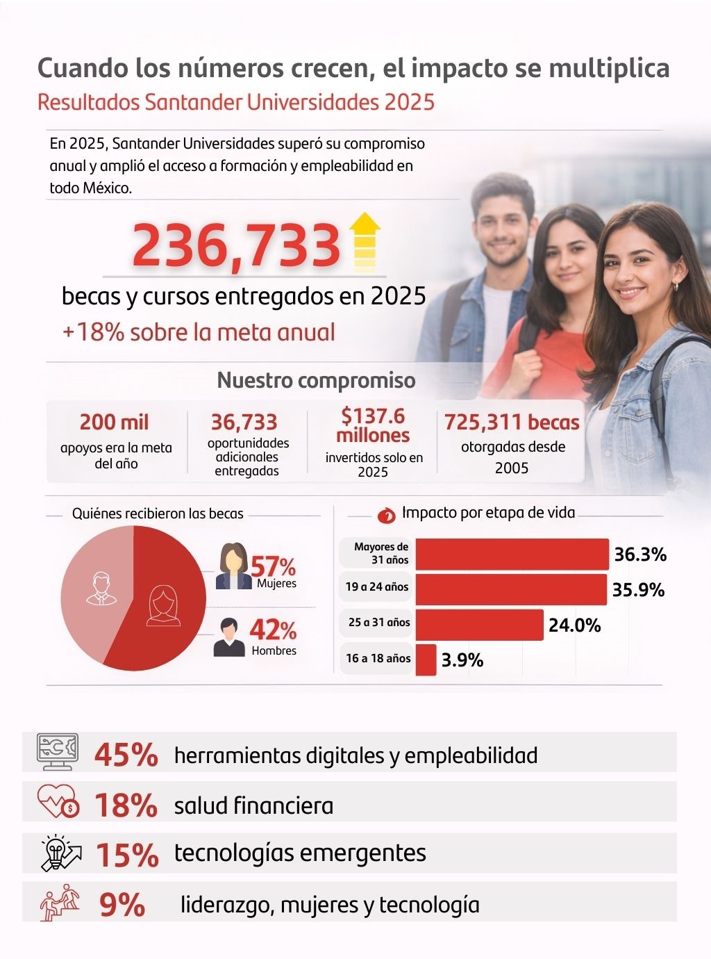 Banco Santander México, a través de Santander Universidades, presentó los resultados 2025 de su estrategia de impulso a la educación, la formación continua y la empleabilidad, con la entrega de 236,733 becas y cursos en todo el país, cifra que supera en 18% el compromiso anunciado a inicios de año de otorgar 200 mil apoyos, la meta anual más alta en la historia de la institución.