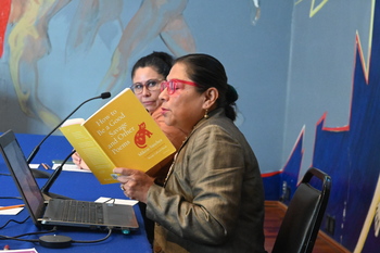 En su exposición hizo un recuento de los logros y los rezagos en la situación de las mujeres indígenas, que entreveró con un recuento de la literatura indígena en general y de la participación en esta de mujeres, así como con la lectura de poesía.