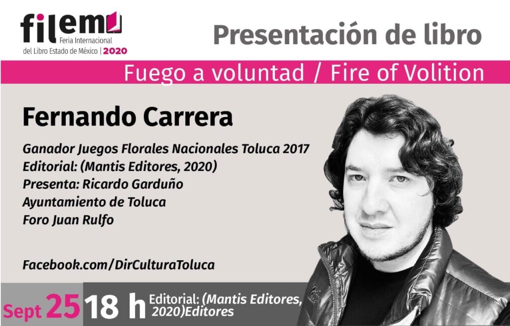 A las 18:00 horas se llevará a cabo la presentación del libro Fuego a voluntad, de Fernando Carrera, ganador de los Juegos Florales Nacionales Toluca 2017, a cargo de Ricardo Garduño; mientras que a las 19:00, el público virtual podrá conocer las obras Grados de miopía (ensayo) de Andrea Chapela, y Antibiótica (poesía) de Ángel Vargas, del Fondo Editorial Tierra Adentro (FETA), siendo la moderadora Paloma Cuevas y, a las 20:00 horas, se ofrecerá la actividad artística Cava Literaria con el Ensamble de Solistas de Toluca.
