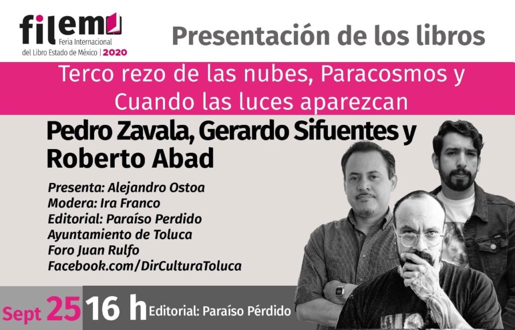 El viernes 25 de septiembre, a las 16:00 horas, se llevará a cabo desde el Foro Juan Rulfo la presentación de los libros Terco rezo de las nubes, Paracosmos y Cuando las luces aparezcan, cuyos autores son Pedro Zavala, Gerardo Sifuentes y Roberto Abad, respectivamente, de la editorial Paraíso Perdido.