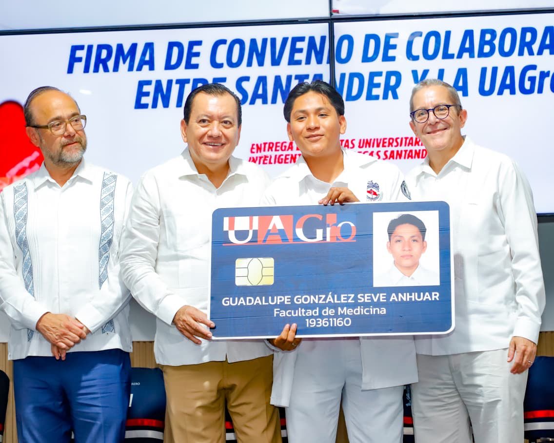 Este martes, el rector de la Universidad Autónoma de Guerrero (UAGro), Javier Saldaña Almazán, y el Director Ejecutivo de Santander Universidades y Director General de Universia México, Arturo Cherbowski Lask, entregaron en Acapulco 12 mil 387 tarjetas universitarias inteligentes, que permitirán a los estudiantes abrir su primera cuenta bancaria, agilizar el pago de servicios sin hacer filas y acceder a diversos beneficios académicos.