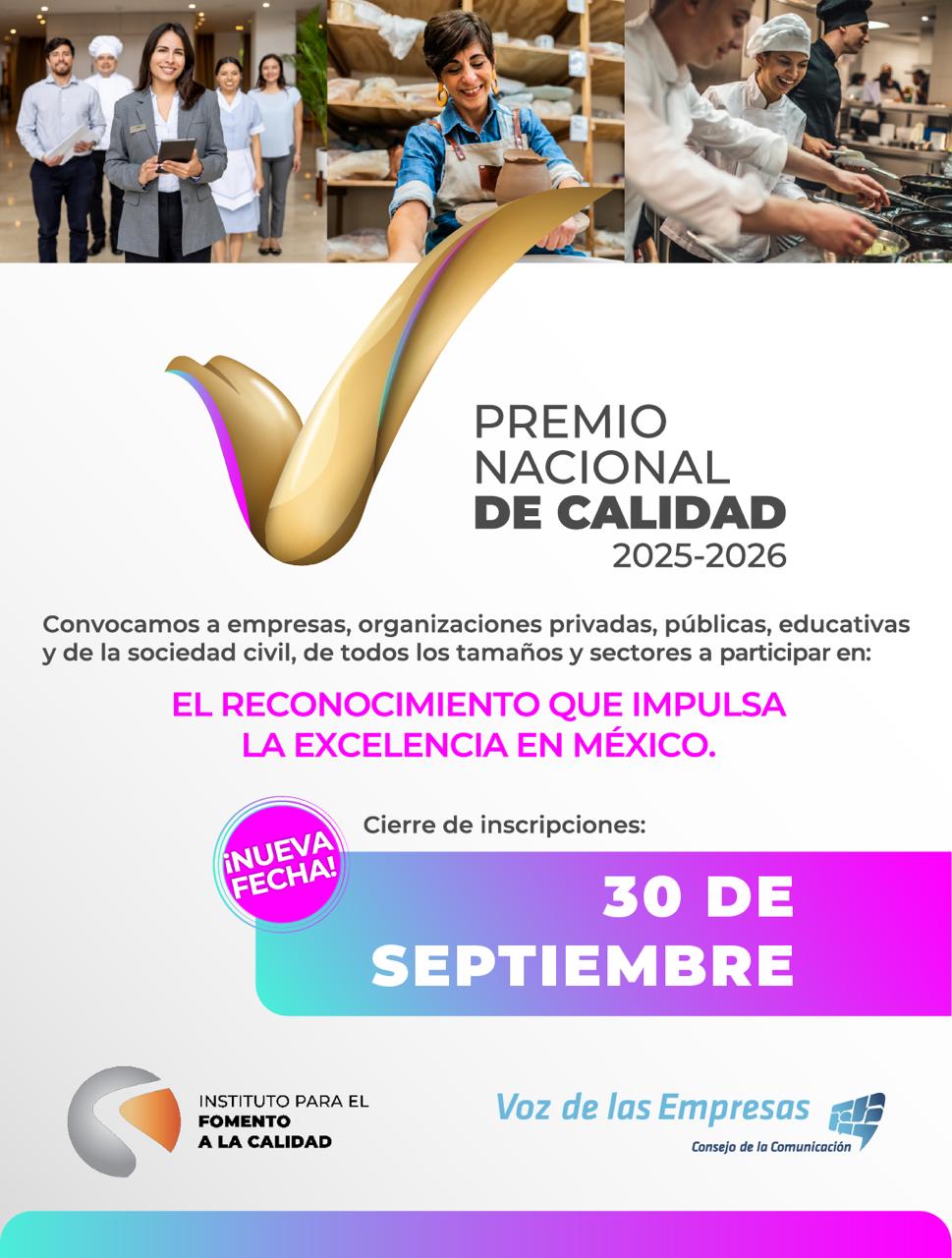 Ciudad de México a 26 de septiembre de 2025.- El Consejo Coordinador Empresarial, el Instituto para el Fomento a la Calidad y el Consejo de la Comunicación, informan que la convocatoria para participar en el Premio Nacional de Calidad 2025 está a unos días de concluir.