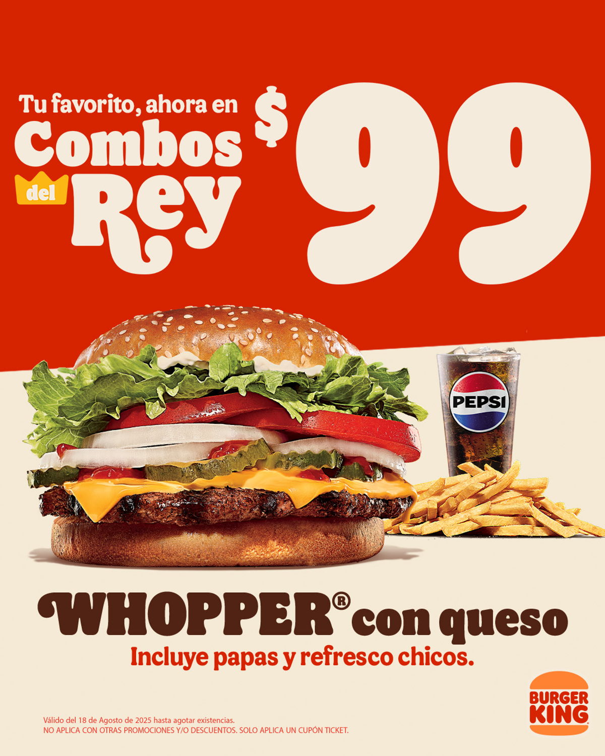 - Burger King, la casa del WHOPPER®, celebra en grande y suma su producto insignia a la plataforma Combos del Rey. Comidas completas y accesibles, por sólo $99 pesos.